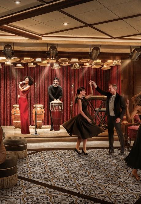 The Top Sail Lounge is the ultimate place to rest and relax after shore excursions or days at sea. Throughout the day, take in crystal-clear panoramic views of the ocean while enjoying crafted drinks, gourmet finger foods, and desserts. At night, relish in exclusive access to live music and after-dinner drinks.